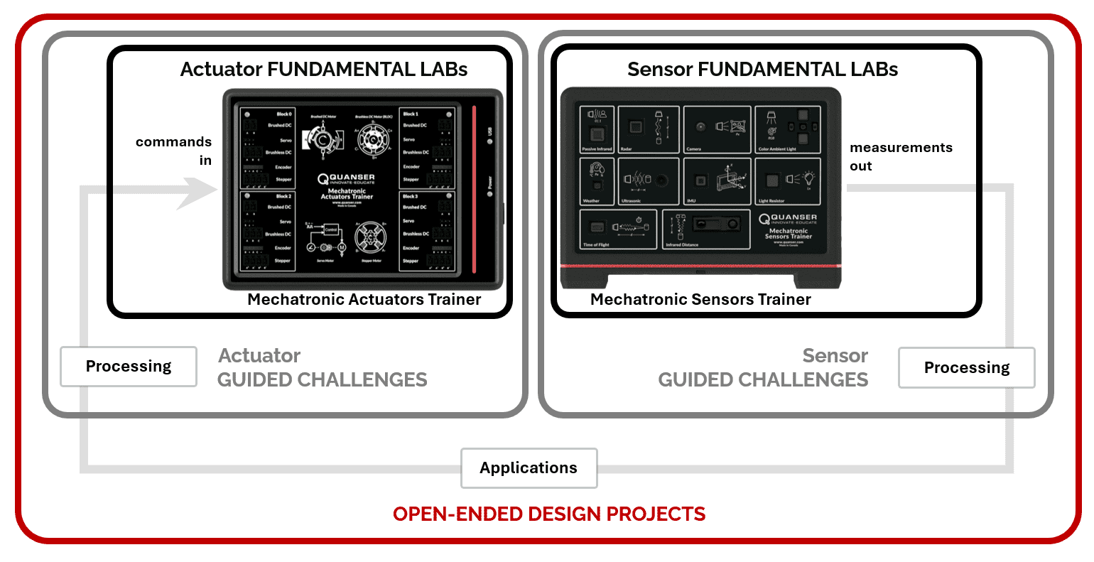 Mechatronics Design Lab は、Quanser のメカトロニクス・センサトレーナーおよびメカトロニクス・アクチュエータトレーナーを用いて、学部学生に包括的かつバランスの取れたメカトロニクス教育を提供したい教育機関向けの、ターンキーソリューションです。